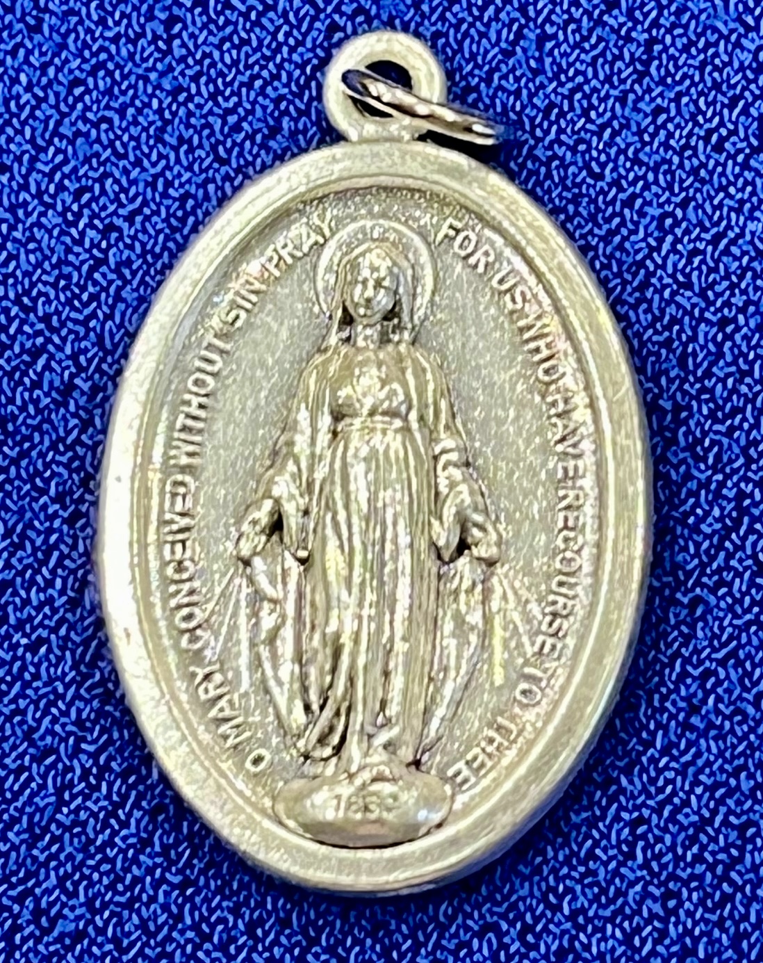 Then as we were about to exit the plane, Father Frankie began groping around his breast pockets then his pants pockets, obviously searching for something. He pulled out a tiny cellophane package containing one of those little pendants (I call them “saint medals”) that Catholics often wear around their necks. This one was the virgin Mary.