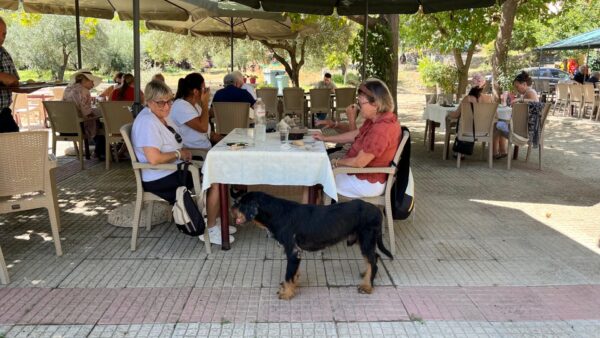 But it wasn’t just at restaurants that you encountered the four-legged inhabitants of Greece, they roamed freely at every gas station we visited, on city streets, and even at the mountaintop monisteries and convents our tour bus struggled to reach (mostly cats in the higher elevations). When we asked the local residents about them, they only shrugged and said that the animals were respected by the Greek people and well taken care of. You could tell that by looking at them. They appeared relatively healthly, happy, rarely approached the tourists, lounged in the shade, coexisted peacefully with one another, and occasionally meandered over to buckets of water placed everywhere for their drinking convenience.