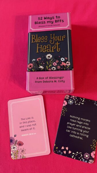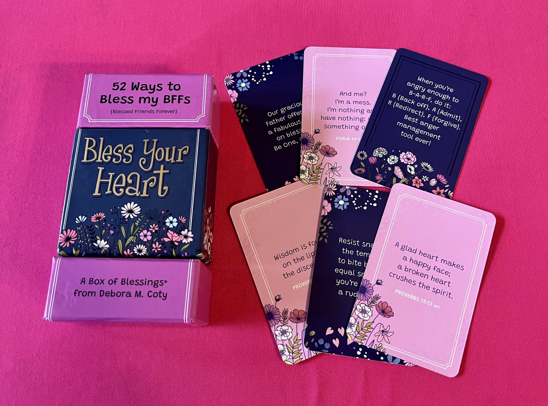 I’m super excited about these new scripture cards just sent to me by my publisher! Aren’t they adorable? They’re meant to be companions to my new devo, Bless Your Heart, and are officially titled, “52 Ways to Bless My BFFs.”